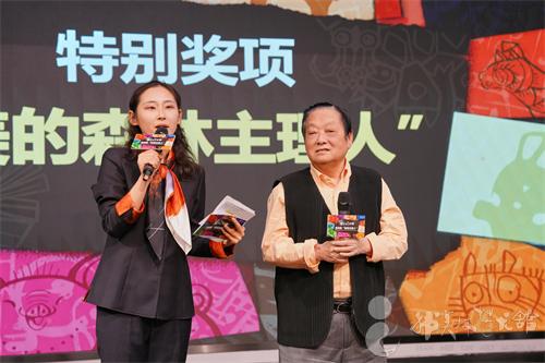 ▲艺术家韩美林(左二),韩美林艺术基金会理事长、五地韩美林艺术馆总馆长周建萍(左一)上台领奖