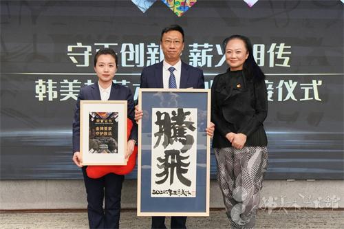 ▲五地韩美林艺术馆总馆长周建萍(右一)为北京航腾物业管理有限责任公司颁发荣誉证书