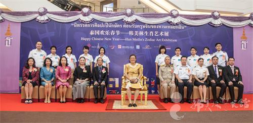 2018年4月,应中国政府的邀请,泰国诗琳通公主访华,期间专程前往北京韩美林艺术馆参观。凭借诸多重要外事活动的实战经验,我们虽然准备了详尽的接待方案和各种应急预案,但还是领教了具有强大阵容的公主团队和各种缜密的接待细节。我们从没有遇见过有着如此强大组织能力的团队,90人的服务团队,无比敬业地通过数次彩排,甚至按照公主的步履速度算好了每一分钟所到之处的时间节点,还几乎改造了我们的洗手间。4月5日下午,公主参观完艺术馆,享受了文化的饕餮盛宴之后来到美林画室,与美林一同愉悦地在画案上谱写了中泰文化艺术交流的新篇章。