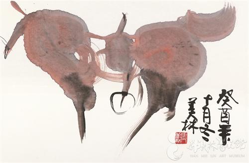 他创作的生肖马独树一帜,不拘外形肖似,通过夸张与抽象赋予拟人化情感。无论是水墨酣畅、青铜凝重,还是陶瓷温润,其“马”皆超越动物描绘的范畴。它们时而如《天书》古文字符,充满洪荒仪式感;时而亦如黄土秦腔,饱含生命悲怆与豪情。这种“从大处入手”、略去繁缛、在动感中提炼神髓的手法,真正实现了“一洗万古凡马空”的艺术境界。而在韩美林的作品中,马既是“站立至死”的尊严象征,也暗合着“天人合一”的生态理念,这与哈尔滨的多民族文化交融基因深度契合。历史上的“胡服骑射”,曾推动了文明互鉴;今日的展览,则以艺术凝聚文化认同,为铸牢中华民族共同体意识躬行实践。