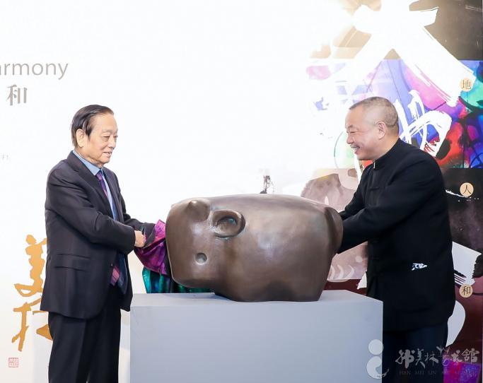 韩美林与关山月美术馆馆长陈湘波共同为韩美林捐赠的雕塑新作《牛》揭幕