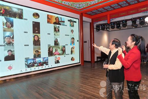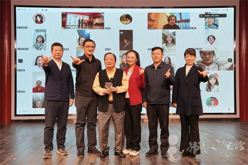 ▲艺术家韩美林(左二),韩美林艺术基金会理事长、五地韩美林艺术馆总馆长周建萍(左一)与员工线上互动