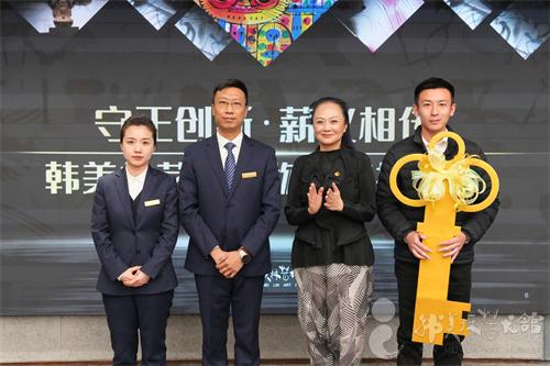 ▲五地韩美林艺术馆总馆长周建萍(右一)为北京航腾物业管理有限责任公司颁发荣誉证书