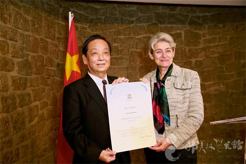▲时任联合国教科文组织总干事博科娃给韩美林颁发“和平艺术家”证书