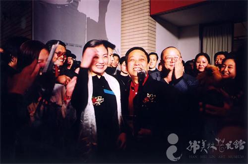 ▲韩美林周建萍夫妇和员工们在一起