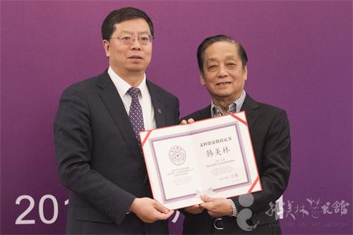 ▲原清华大学校长邱勇为韩美林颁发文科资深教授证书
