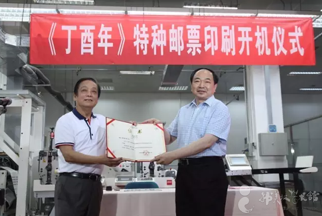 在仪式上,《丁酉年》邮票设计者韩美林向中国邮政集团公司总经理李国华赠送两幅邮票设计原稿,两人共同签批邮票印样、启动邮票印刷开机按钮后,随着机器流畅地运转,一张张带着温度的《丁酉年》邮票版张经过一道道工序,徐徐地呈现在人们眼前,这又让人们对于2017年1月5日《丁酉年》邮票的发行有了无限想象。