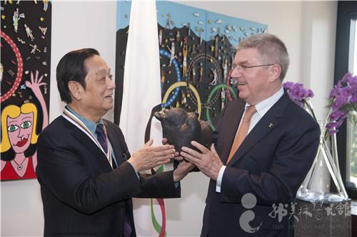 ▲韩美林周建萍夫妇与国际奥委会主席巴赫