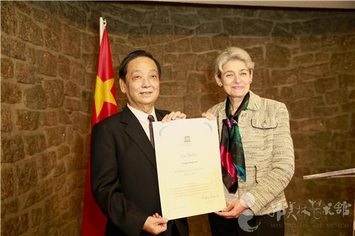 ▲2015年,时任联合国教科文组织总干事博科娃给韩美林颁发“和平艺术家”证书